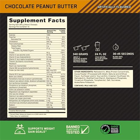Thông tin sản phẩm Optimum Nutrition Serious Mass, Weight Gainer Protein Powder, Mass Gainer, Vitamin C and Zinc for Immune Support, Creatine, Chocolate Peanut Butter, 12 Pound (Packaging May Vary)