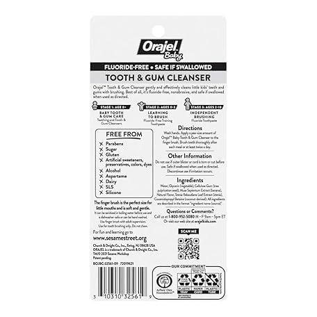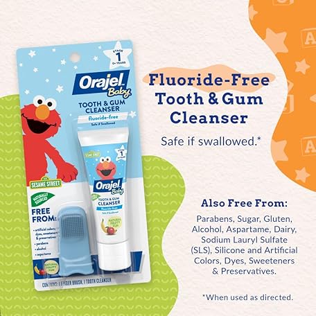 Thông tin sản phẩm Orajel Baby Elmo Tooth & Gum Cleanser Fluoride-Free, 1 Finger brush, 1 Toothpaste 1oz; #1 Pediatrician Recommended Fluoride-Free Toothpaste*