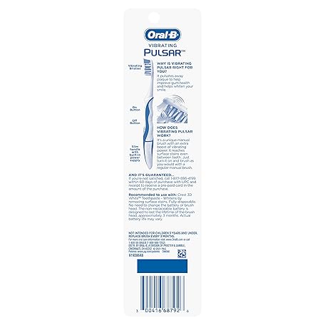 Sản phẩm Oral-B 3D White Pulsar, Battery electric toothbrushes, 2 count SOFT toothbrush pack, removes stains, whitens teeth, travel essentials tooth brush đang được bán với giá ưu đãi là $15.2491 tại nước Mỹ.