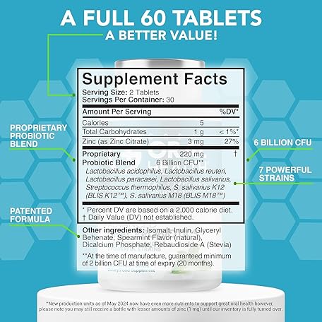 Thông tin sản phẩm Oral Probiotics for Mouth Bad Breath Treatment for Adults; Dentist Formulated Dental Probiotics for Teeth and Gums Health & Chronic Halitosis with BLIS K12 M18, 60 Chewable Oral Health Tablets Mint