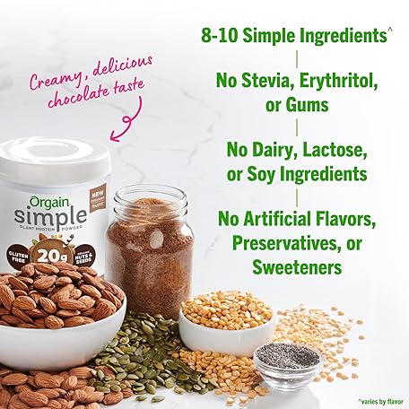 Thông tin sản phẩm Orgain Organic Simple Vegan Protein Powder, Chocolate - 20g Plant Based Protein, Made with less Ingredients, No Artificial Sweeteners, Gluten Free, No Dairy or Lactose, 1.25 lb (Packaging May Vary)