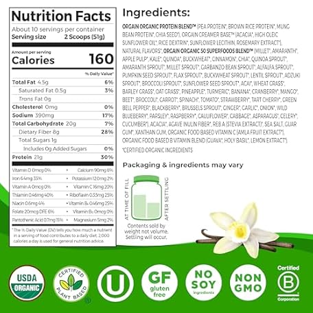 Thông tin sản phẩm Orgain Organic Vegan Protein + 50 Superfoods Powder, Vanilla Bean - 21g Plant Based Protein, 8g Prebiotic Fiber, No Lactose Ingredients, Gluten Free, No Added Sugar, 1.12 lb (Packaging May Vary)