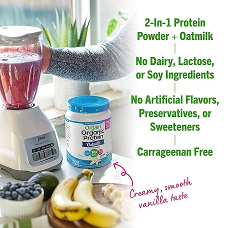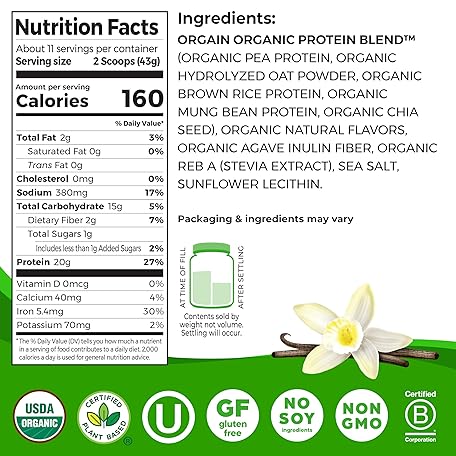 Thông tin sản phẩm Orgain Organic Vegan Protein Powder + Oat Milk, Vanilla Bean - 20g Plant Based Protein, Gluten Free, No Dairy, Soy or Lactose Ingredients, Low Sugar, Non-GMO, Kosher, For Shakes & Smoothies - 1.05lb