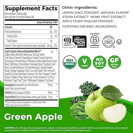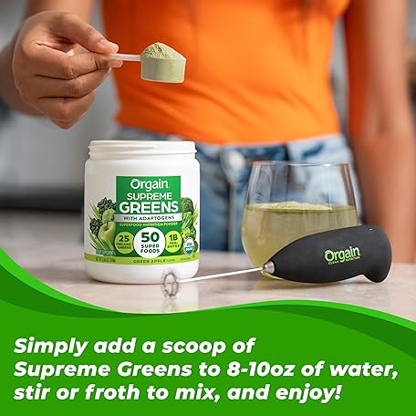 Thông tin sản phẩm Orgain Supreme Greens Powder with 25 Organic Greens, 50 Superfoods, 1 Billion Probiotics, and Adaptogens, Vegan Greens for Gut Health and Immune Support, 1.5 Servings of Fruit and Veggies, Green Apple
