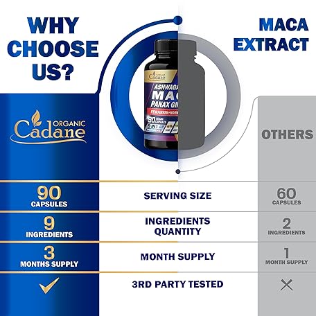 Thông tin sản phẩm Organic Cadane Maca Root, Ashwagandha, Panax Ginseng Supplement - 90 Capsules 3 Months with Fenugreek, Tongkat Ali & More - Support Energy Production & Immunity