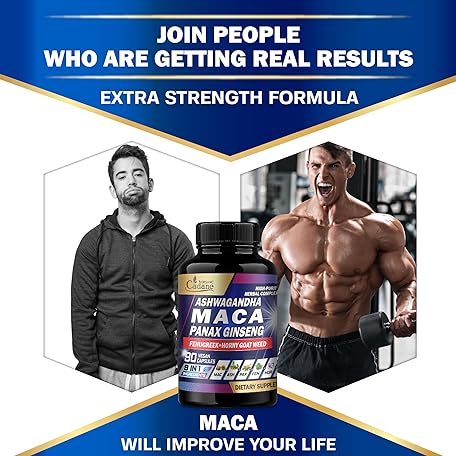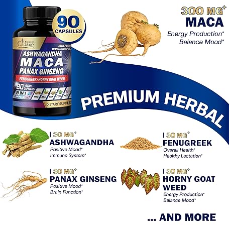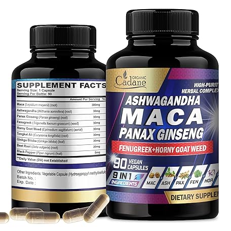 Sản phẩm Organic Cadane Maca Root, Ashwagandha, Panax Ginseng Supplement - 90 Capsules 3 Months with Fenugreek, Tongkat Ali & More - Support Energy Production & Immunity đang được bán với giá ưu đãi là $18.5191 tại nước Mỹ.
