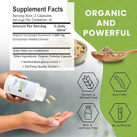 Thông tin sản phẩm Organic Cordyceps Mushroom Capsules Supplement - 1000mg Cordyceps Militaris Extract - 100% Natural, Real & Pure - Beta-Glucan - Herbal Support for Energy-Boosting & Immune Health - 60 Capsules