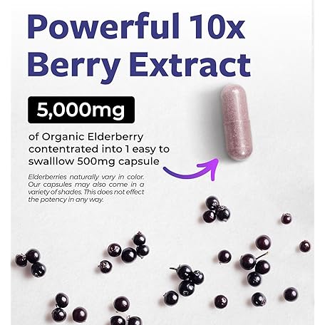 Thông tin sản phẩm Organic Elderberry Capsules - 10:1 Extract Equals 5,000mg of Fresh Elderberries (Vegan) for Immune Support, Allergy, Sinus Relief - Sambucus Nigra - Black Elderberry - 30 Caps (No Pills or Gummies)
