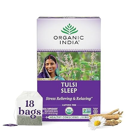Thông tin sản phẩm ORGANIC INDIA Tulsi Sleep Herbal Tea - Holy Basil, Ashwagandha, Chamomile, Night Time Tea for Bedtime, Stress Relieving & Relaxing, Immune Support, USDA Certified Organic - 18 Infusion Bags, 1 Pack
