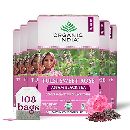 ORGANIC INDIA Tulsi Sweet Rose Assam Black Tea - Stress Relieving & Elevating, 17mg of Caffeine Per Cup, With Ayurvedic Herbs, Vegan, USDA Organic, Non-GMO - 18 Rose Tea Bags (Pack of 6)