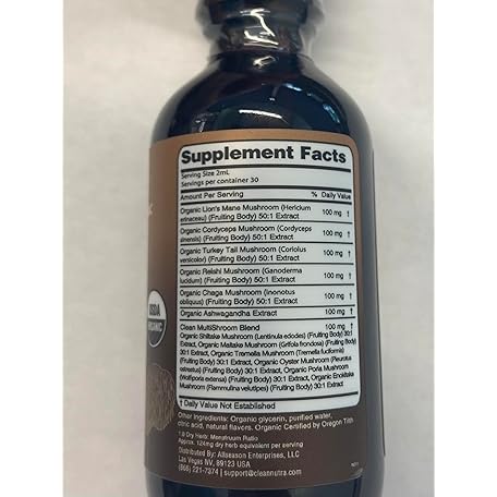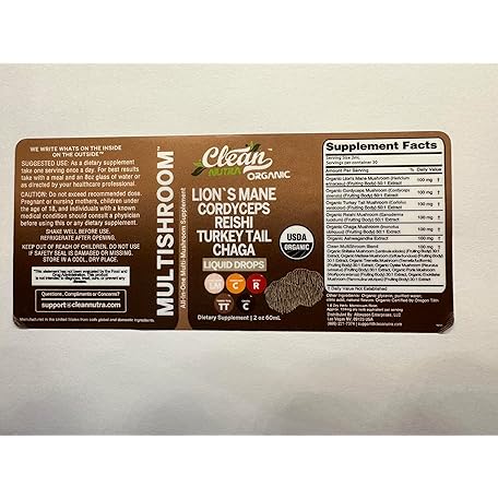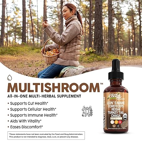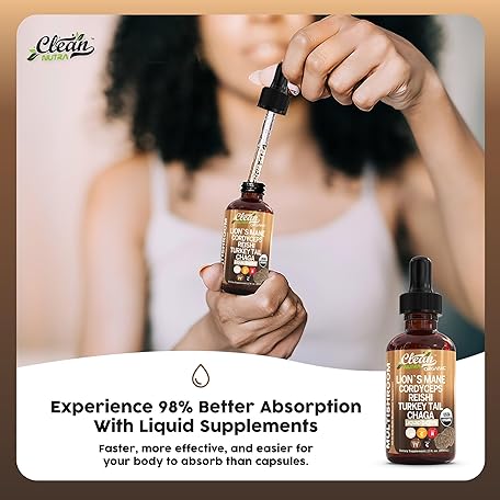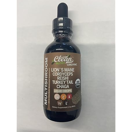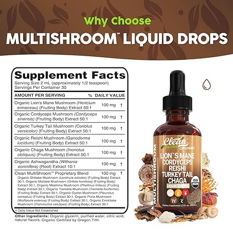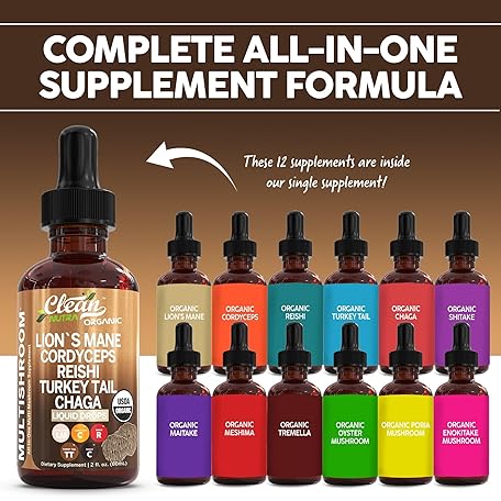 Organic Lions Mane Mushroom Supplement Liquid Drops + Turkey Tail Cordyceps Reishi Chaga Shitake Maitake Tremella Oyster Mushrooms Poria and Enokitake Complex Blend by Clean Nutra