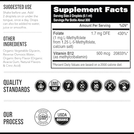 Thông tin sản phẩm Organic Methyl Folate 1000 mcg + Methyl B12 Cofactor (300 Servings) – Metabolically Active 5-MTHF Form, Organic Berry Flavor, Liquid Sublingual Form – Mood, Cognition, Methylation, Pregnancy (1oz)
