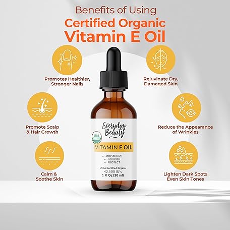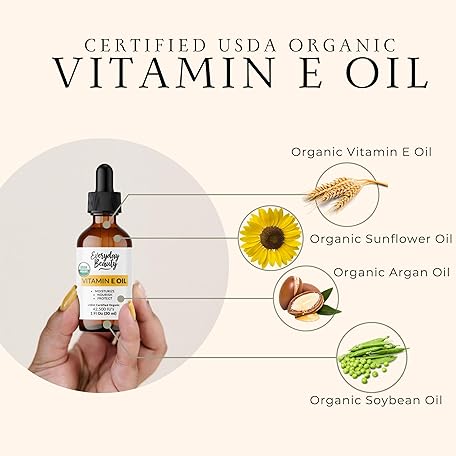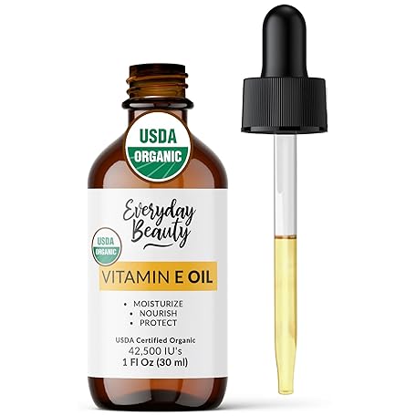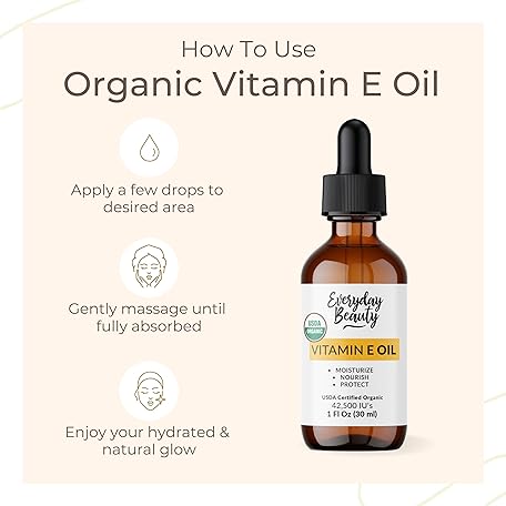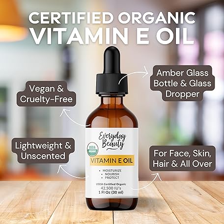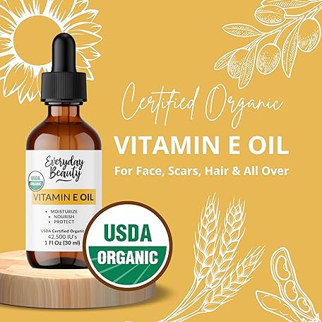 Organic Vitamin E Oil – Certified Organic Blend of Vitamin E - Deeply Hydrating Care for Face, Skin, Hair, Scars – Antioxidant-Rich, Fragrance-Free, and Gentle on Skin - 1 Fl Oz Glass Dropper & Bottle
