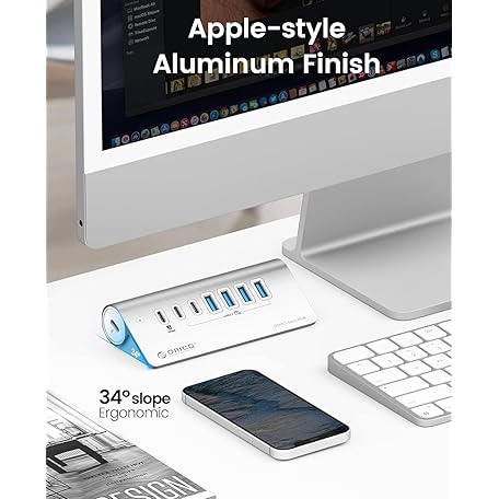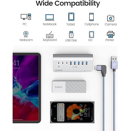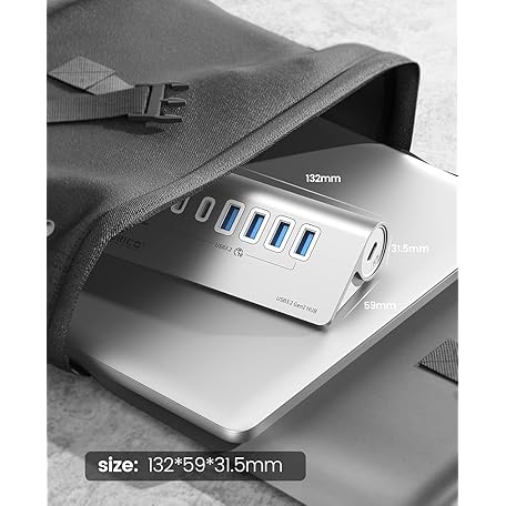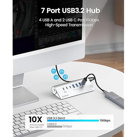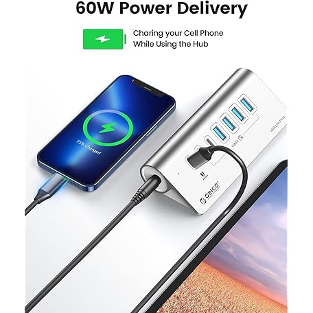 ORICO 7 Port USB Hub 10Gbps, Aluminum USB 3.2 Gen 2 Hub, 6 USB 3.2 Data Ports, 1 PD 60W Ports, 24V 3A Power Adapter, 3.28Ft A to C Cable, USB Data Hub for Laptop