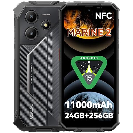 OSCAL Marine 2 Rugged Phone (2025),11000mAh Rugged Smartphone, NFC, 24GB +256GB/ 2TB TF, Android 15 Phone, 90HZ,18W, 16+8MP, Gemini AI Gaming Phones, IP69K Protection,6.56"HD, Dual SIM/1TF Slots,Black