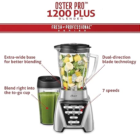 Thông tin sản phẩm Oster Pro 1200 Smoothie Blender with Glass Jar & 24oz To-Go Cup, Countertop Kitchen Blender with 7 Speeds, 1200W Power, Brushed Nickel