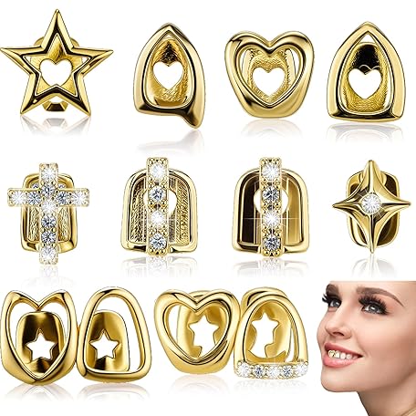 Otoolling 9 Pcs Grill for Women Gold Plated Grills for Teeth Punk Cross Hollow Heart Star Tooth Single Grill Cap Hip Hop Jewelry Gift for Women Men Rapper Halloween Costume Cosplay