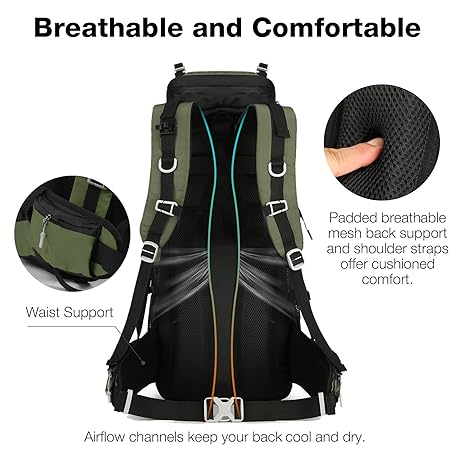 • Outplea 60L Waterproof Backpacking Hiking Backpack with Rain Cover for Men Women, Large Camping Backpack, Green