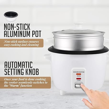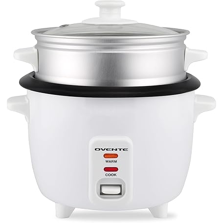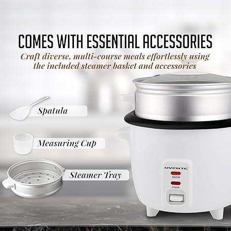 Thông tin sản phẩm OVENTE Electric Rice Cooker and Food Steamer – 10-Cup Cooked Capacity (5 Cups Uncooked), Nonstick Removable Pot, Keep Warm Function, Steaming Basket, Measuring Cup & Spatula Included, White RCS01W