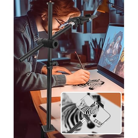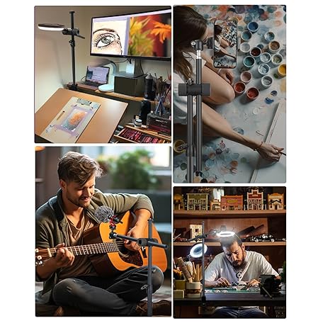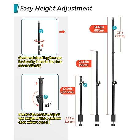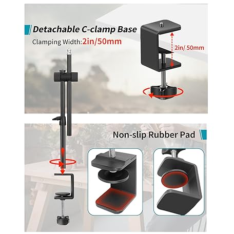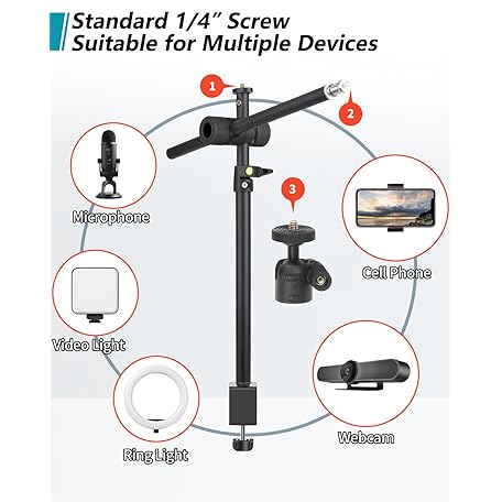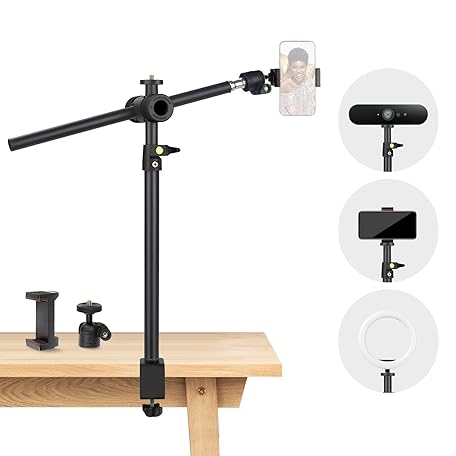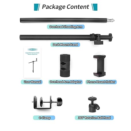 Thông tin sản phẩm Overhead Camera Mount Desk Stand, Camera Arm Desk Mount Clamp Stand with 360°Adjustable Magic Arm, Webcam Arm Mount Stand w Ballhead Phone Mount for Desk Logitech Microphone Video Light Cell Phone