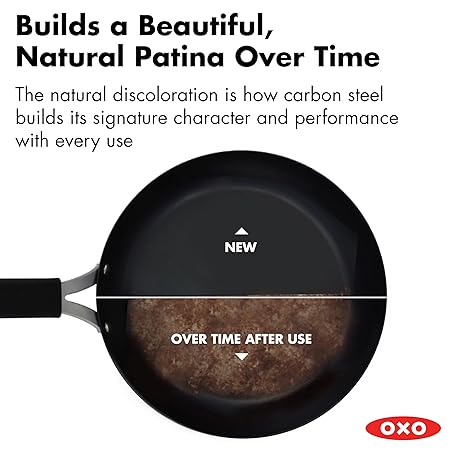 Thông tin sản phẩm OXO Obsidian Pre-Seasoned Carbon Steel, 10" Frying Pan Skillet with Removable Silicone Handle Holder, Induction, Oven Safe, Black