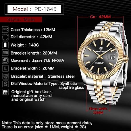 Thông tin sản phẩm Pagani Design PD1645 Men's Watch 42MM Men's Automatic Watch Japan NH35 A Automatic Movement 100M Water Resistant, Stainless Steel, Sapphire Mirror, Sport Business Watch.