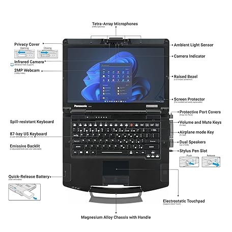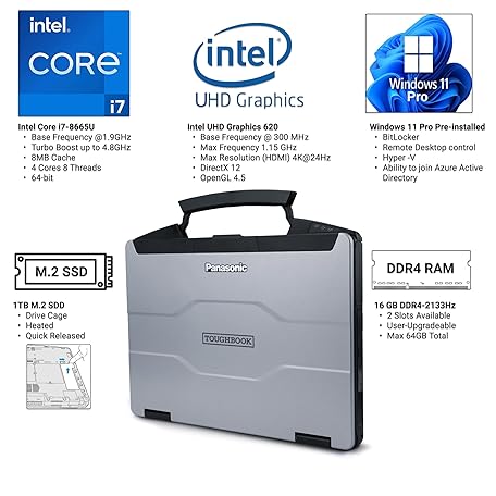 • Panasonic Toughbook FZ-55 MK1, 14-inch FHD 1920x1080 Touchscreen Display Intel Core i7-8665U, 16GB RAM, 1TB SSD, 4G LTE, USB-C, Windows 11 Pro (Renewed)
