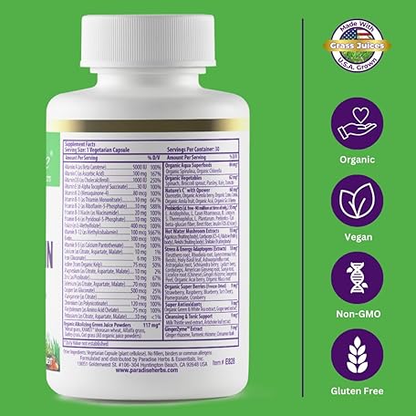 Thông tin sản phẩm Paradise Herbs Earth's Blend Women's Once Daily Multivitamin with Iron, 48 Organic Superfoods, Probiotics, Antioxidants, Vitamins A, B12, C, D, K2, Daily Superfood, 30 Capsules