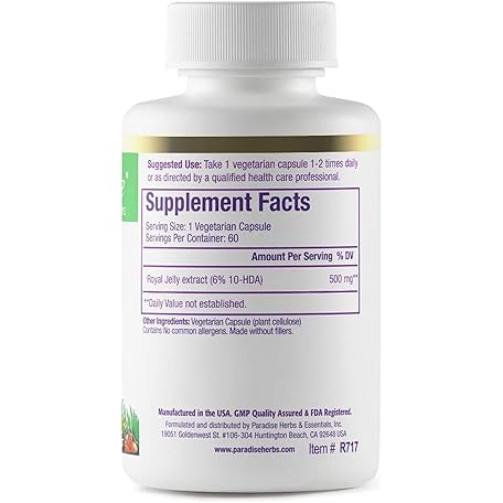 Thông tin sản phẩm Paradise Herbs Royal Jelly, Golden Emperor, Super Potent, Ultra Pure, Vegan, Gluten Free, Non-GMO, Freeze-Dried Concentrate, 60 Count Vegetarian Capsules
