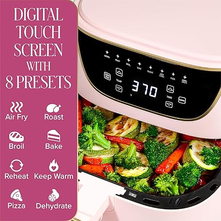 Thông tin sản phẩm Paris Hilton Air Fryer, Large 6-Quart Capacity, Nonstick Made without PFAS, Touchscreen Display, 8-in-1 (Air Fry, Roast, Broil, Bake, Reheat, Keep Warm, Pizza, Dehydrate), Dishwasher Safe, Pink