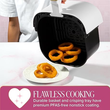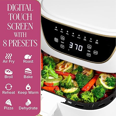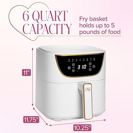 Thông tin sản phẩm Paris Hilton Air Fryer, Large 6-Quart Capacity, Nonstick Made without PFAS, Touchscreen Display, 8-in-1 (Air Fry, Roast, Broil, Bake, Reheat, Keep Warm, Pizza, Dehydrate), Dishwasher Safe, White