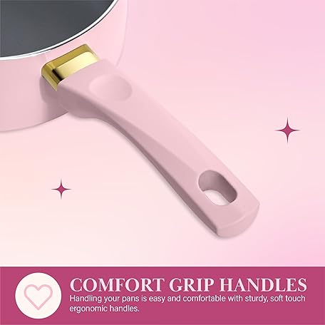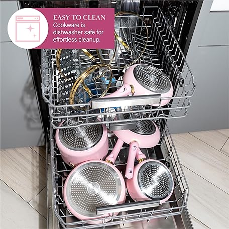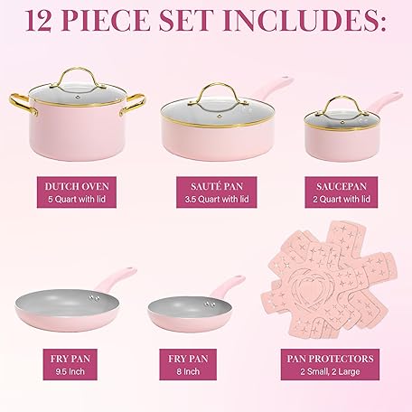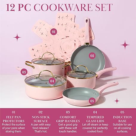 Thông tin sản phẩm Paris Hilton Epic Nonstick Pots and Pans Set, Multi-layer Nonstick Coating, Tempered Glass Lids, Soft Touch, Stay Cool Handles, Made without PFOA, Dishwasher Safe Cookware Set, 12-Piece, Pink