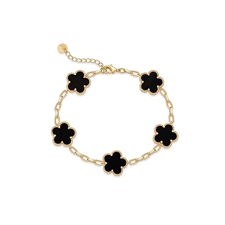PAVOI 14K Gold Plated Clover Bracelets for Women - Flower Four Leaf Clover Bracelet - Mother of Pearl & Onyx Gemstone Lucky Flower Design - Adjustable Trendy Jewelry Gifts