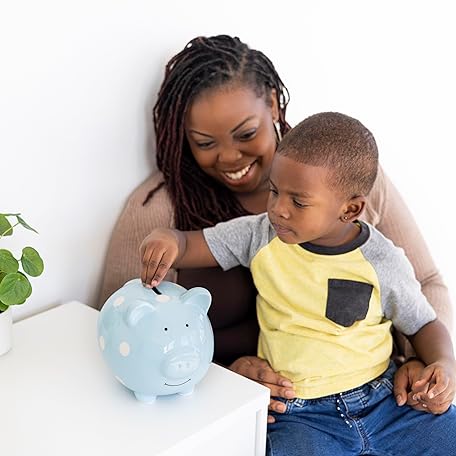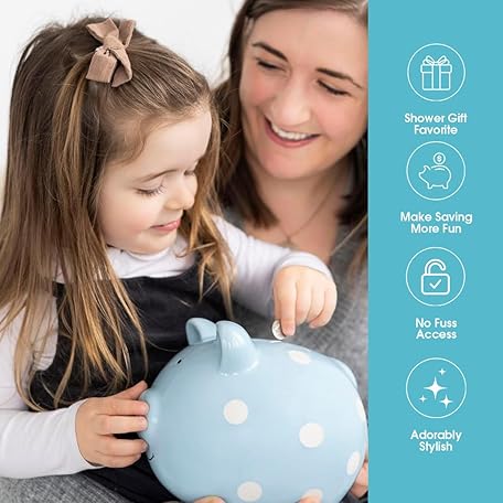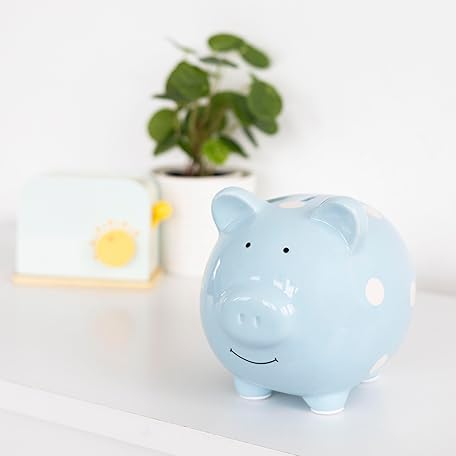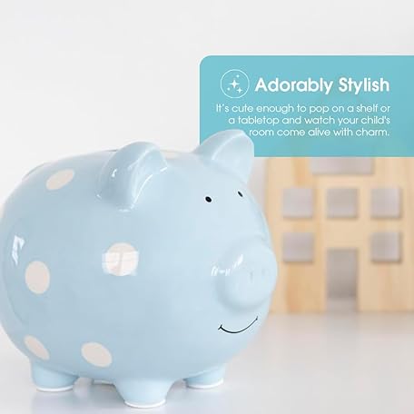 Thông tin sản phẩm Pearhead Large Ceramic Piggy Bank, Blue Polka Dots, Ideal for Boys and Girls, Kids, Money and Coin Bank, Perfect Baby Boy Nursery Décor, Holiday Toddler Gift