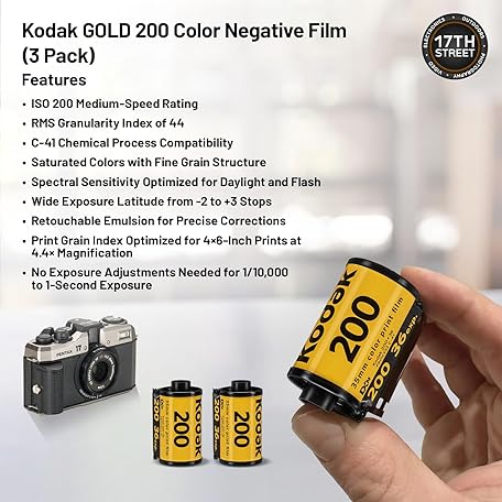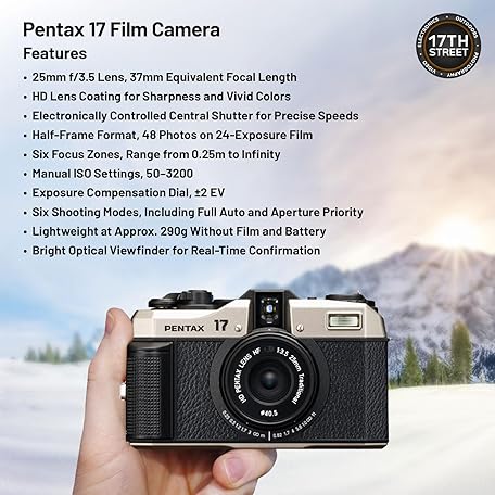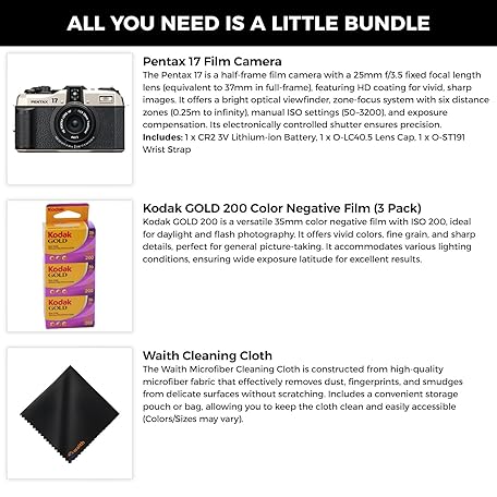 Thông tin sản phẩm Pentax 17 Compact Film Camera with Half-Frame Format, 25mm F3.5 Lens, Manual ISO 50-3200, 6 Zone Focus, Includes Kodak Gold 200 Color Negative 35mm Roll Film (3 Pack) & Cleaning Cloth Bundle Kit