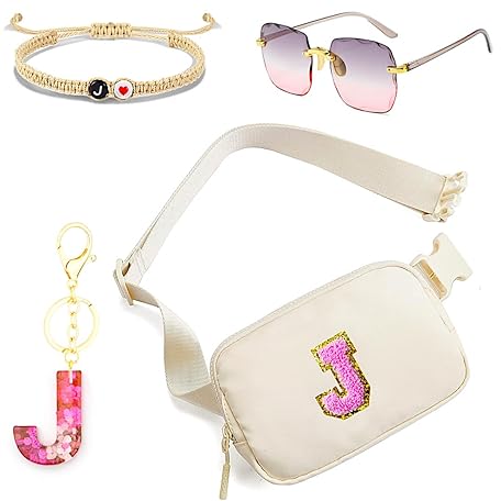 Personalized Initial Fanny Pack Belt Bag for Teen Girls - woman fanny pack,Bracelet, Keychain & Sunglasses (J)