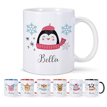 Personalized Name Christmas Coffee Mugs Kids Hot Chocolate Mug Cute Cartoon Animal Hot Cocoa Mug Gifts for Boys Girls 11 oz Ceramic Tea Cup Customized Christmas Eve Winter Holiday Gifts Xmas Decor