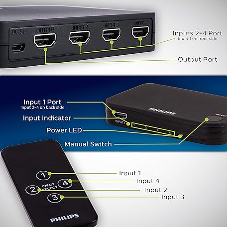 Thông tin sản phẩm PHILIPS 4 Device HDMI Switch, Wireless Remote, Use with 4K Smart TV Roku Xbox PS3 PS4 Fire Stick DVD Blu Ray Fire TV HDTV Cable Box PC, 4K 1080p 60 FPS, Ultra HD, HDCP 2.0, Black, SWV9484B/27