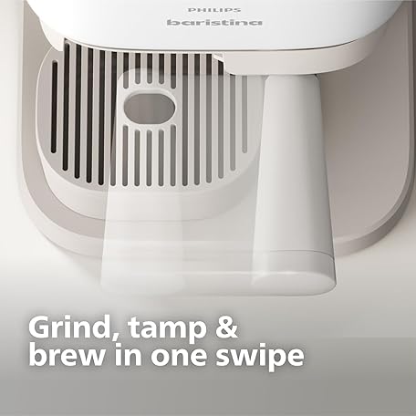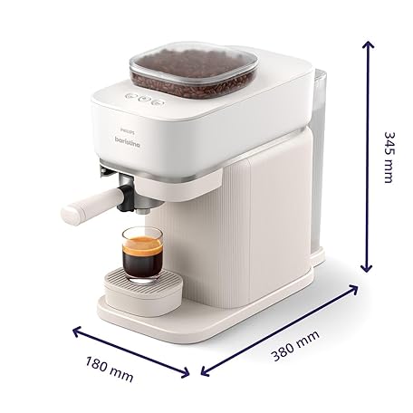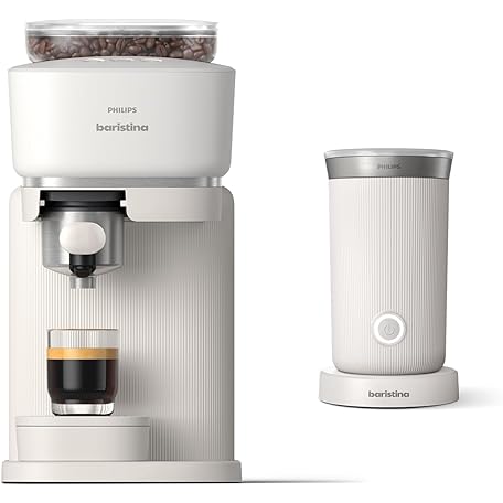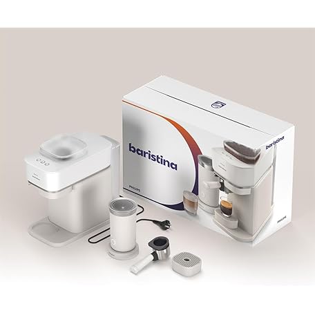 Thông tin sản phẩm Philips Baristina Espresso Machine+Milk Frother Bundle. Real espresso. Compact coffee machine, portafilter, grinder, Cafe Crema. Dairy & Non-Dairy Milk foam. Hot & Cold. Easy Clean. White (BAR303/00)