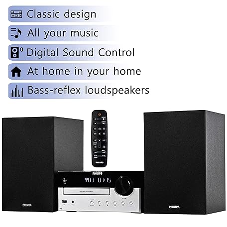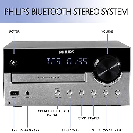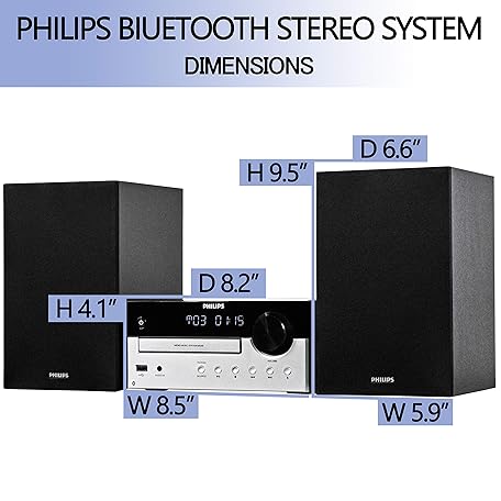 Thông tin sản phẩm PHILIPS Bluetooth Stereo System for Home with CD Player, MP3, USB, Audio in, FM Radio, Bass Reflex Speaker, 60W, Remote Control Included