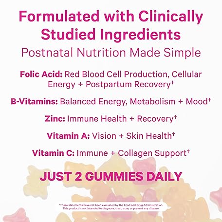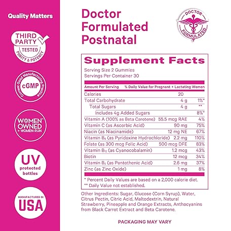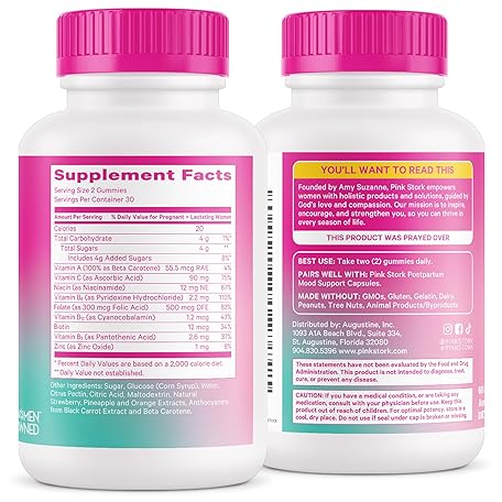 Thông tin sản phẩm Pink Stork Total Postnatal Vitamin Gummies - Multivitamin for Postpartum Recovery and Lactation Support - Folic Acid, B6, & Vitamin C - Postpartum Essentials - 60 Gummy Vitamins