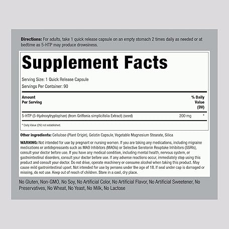 Sản phẩm Piping Rock 5-HTP Supplement | 200mg | 90 Capsules | 5-Hydroxytryptophan | Griffonia Simplicifolia Extract | Non-GMO, Gluten Free đang được bán với giá ưu đãi là $16.3391 tại nước Mỹ.