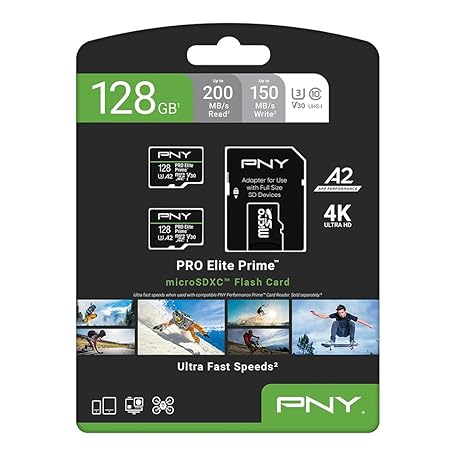 Thông tin sản phẩm PNY 128GB PRO Elite Prime C10 U3 V30 A2 microSDXC Flash Memory Card – Ultra-Fast Speeds, Read 200MB/s, Write 150MB/s, 4K UHD, Full HD, UHS-I, for Smartphones, Drones, Action Cameras, 2-Pack