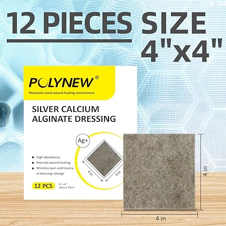 Thông tin sản phẩm Polynew Silver Calcium Alginate Dressing, 4"x4"-12 Individual Pack, Highly Absorbent Ag Alginate Wound Bandage, Non-Adhesive Wound Dressing for Bed Sore, Pressure Sore, Leg Ulcer Wound Health