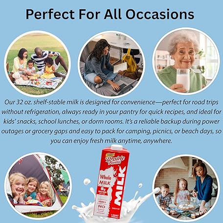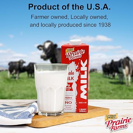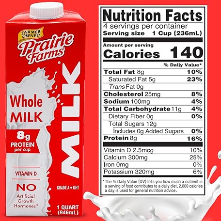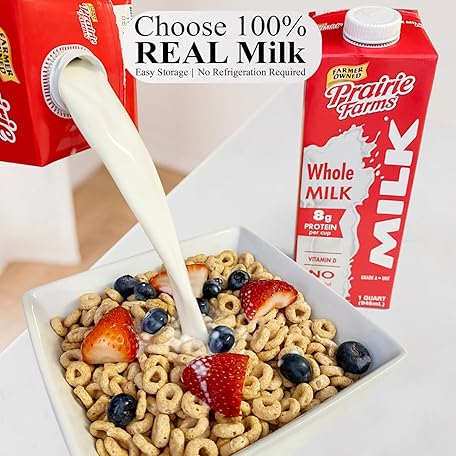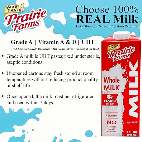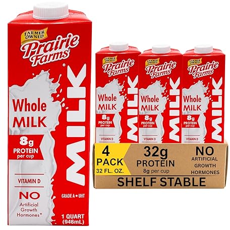 Thông tin sản phẩm Prairie Farms Whole Milk, Shelf Stable, Boxed & Ultra Pasteurized (UHT), Vitamin D White Milk - Preservative and Hormone Free, Gluten Free, Kosher, Made in USA - 1 Quart (4 Pack)