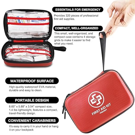 Thông tin sản phẩm Premium First Aid Kit, 320 Piece Waterproof Hard Shell Eva First Aid Kit for Home, Camping, Cars, Hiking, Travel, Businesses & Outdoor Emergencies - Emergency Medical Kits (Red)