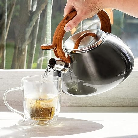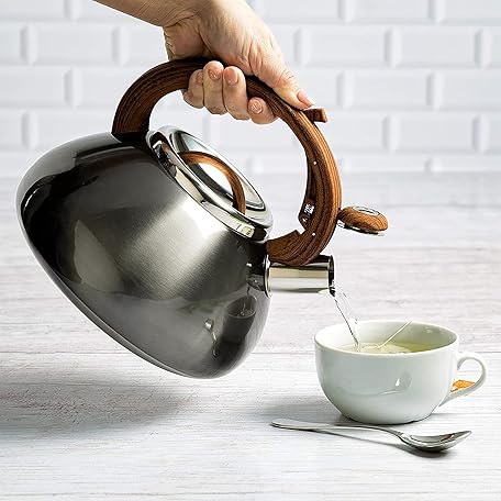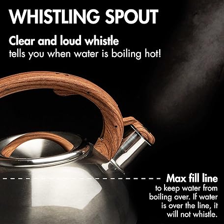 Thông tin sản phẩm Primula Avalon Whistling Stovetop Tea Kettle, Food Grade Stainless Steel Wide Mouth, Fast to Boil, Cool Touch Handle, 2.5-Quart, Gunmetal Grey and Wood-Look