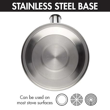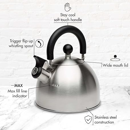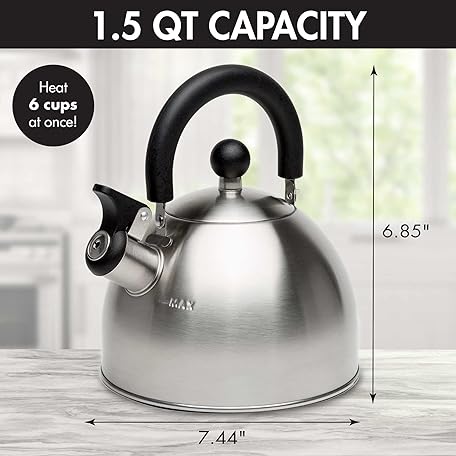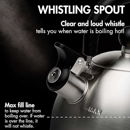 Thông tin sản phẩm Primula Stewart Whistling Stovetop Tea Kettle Food Grade Stainless Steel, Hot Water Fast to Boil, Cool Touch Folding, 1.5-Quart, Brushed with Black Handle