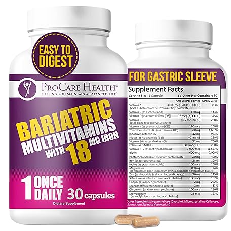 Sản phẩm ProCare Health Bariatric Multivitamin with Iron 18mg (30 Easy to Swallow Capsules) - Post Op Bariatric Vitamins for Gastric Bypass Pills - Must Haves for Sleeve Patients (1 Month Supply) đang được bán với giá ưu đãi là $24.4705 tại nước Mỹ.