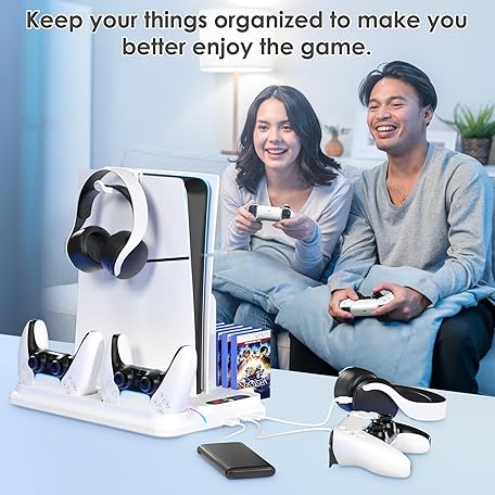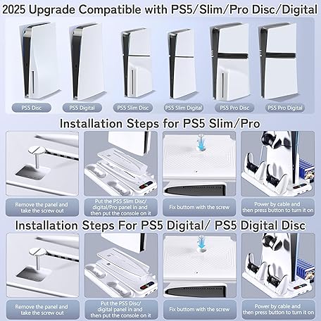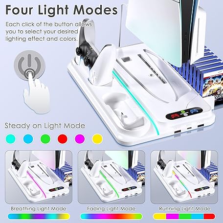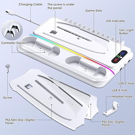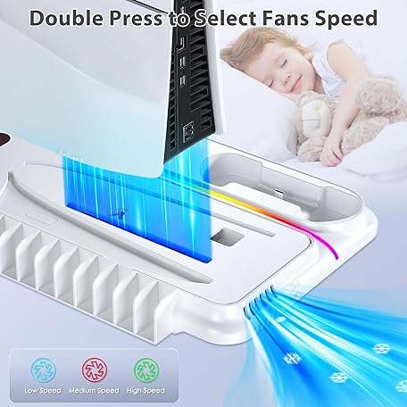 Thông tin sản phẩm PS5 Cooling Station for PS5/Slim/Pro Disc Digital Console,PS5 Fan Cooling Fan with Dual PS 5 Controller Charger,3 Level Fan, RGB Light,12 Slot, PS5/Slim/Pro Stand for PlayStation 5 Console Accessories